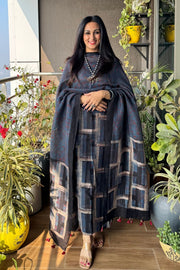 Good-quality Ajrakh hand block printed crushed linen silk kurta material, paired with a stunning crushed pure linen silk dupatta.