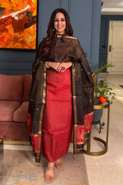 *Pure Maheshwari handloom silk by tissue kurta dupatta set with golden zari booty in the palla.