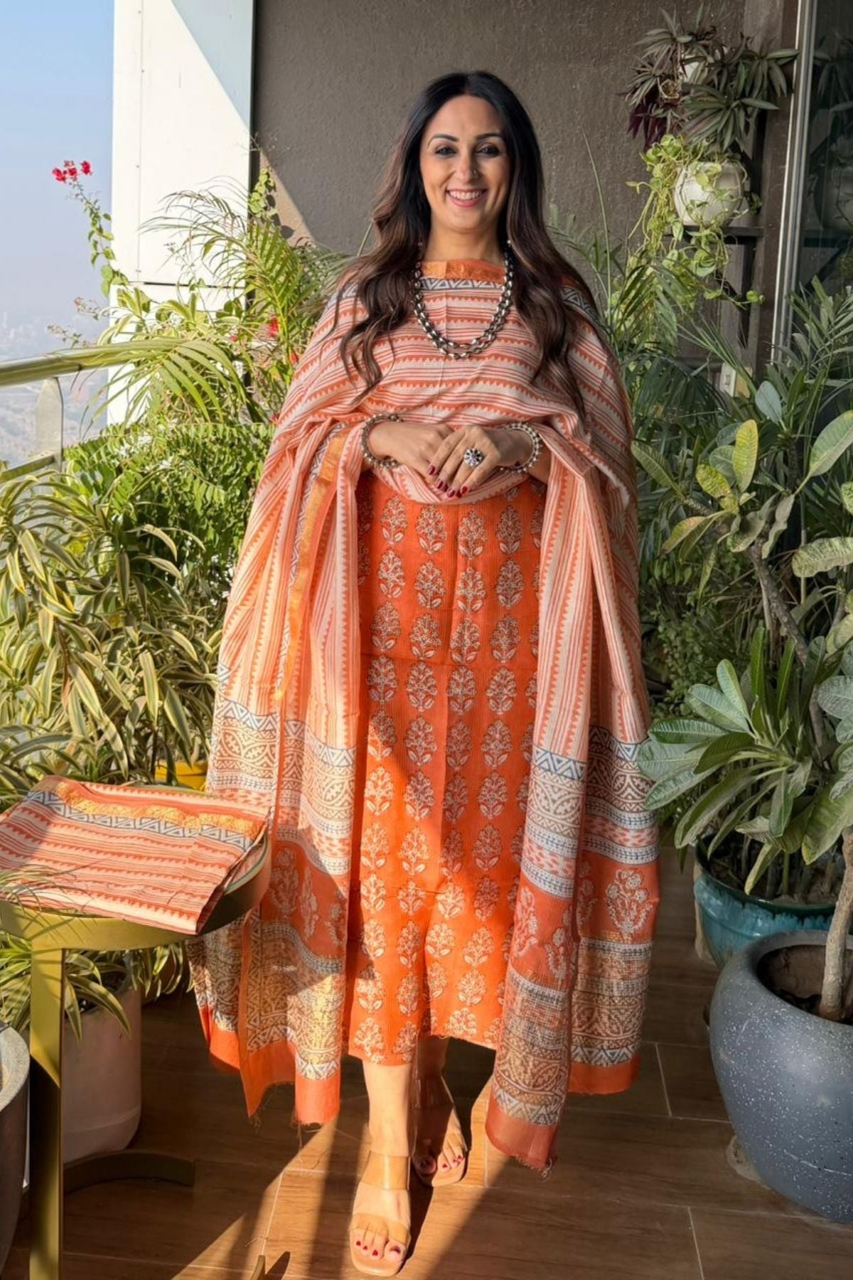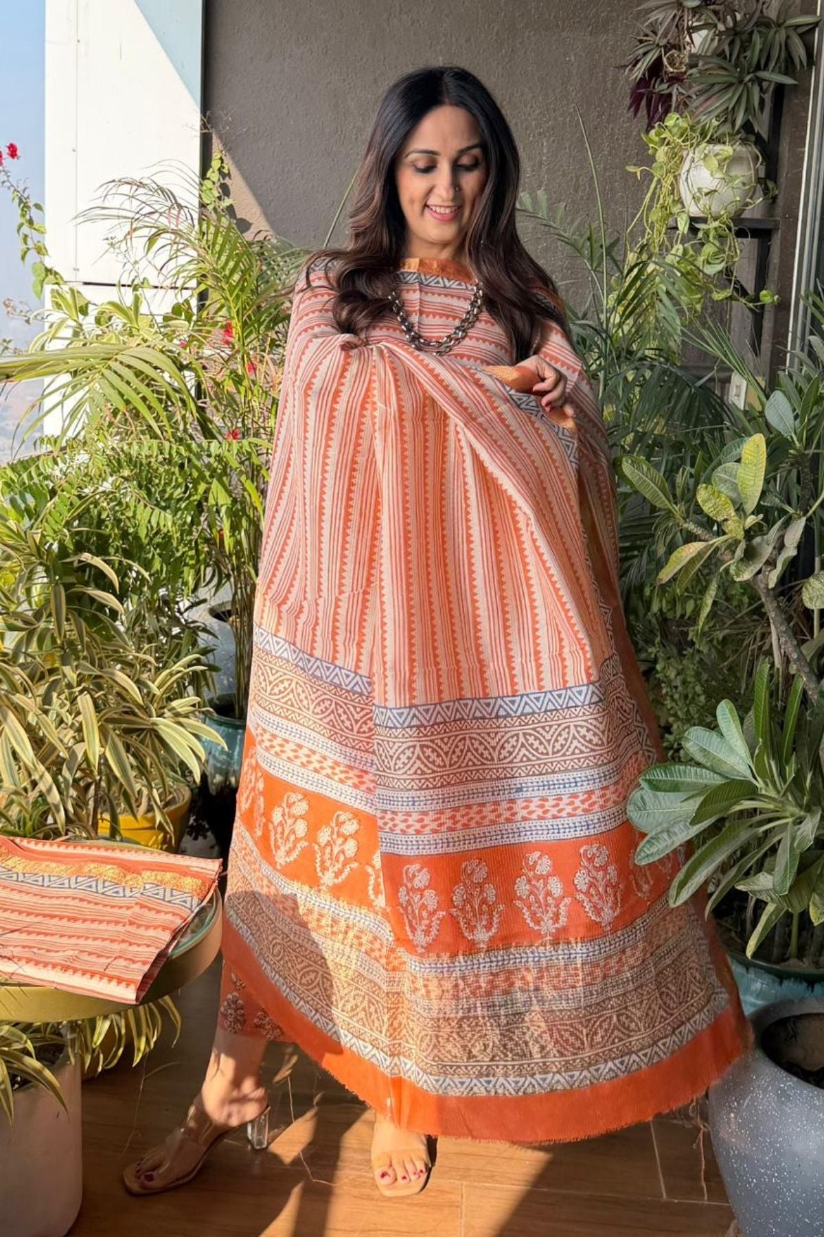This finest quality bagh hand block printed Maheshwari silk 3 -piece suit material teamed with very fine zari patta on dupatta is made using natural dyes through traditional processes.