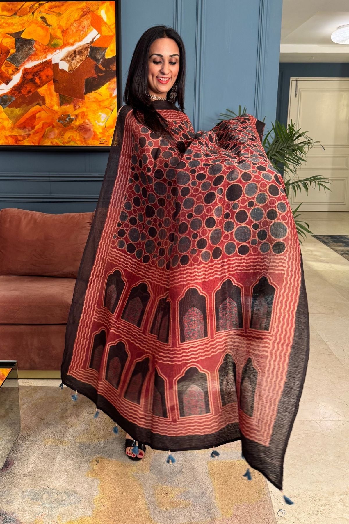 Good-quality Ajrakh hand block printed crushed linen silk kurta material, paired with a stunning crushed pure linen silk dupatta.