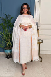 Kurta fabric has beautiful Jamdani weave all over teamed with beautiful Jamdani Zari weave dupatta completed with tassels💫