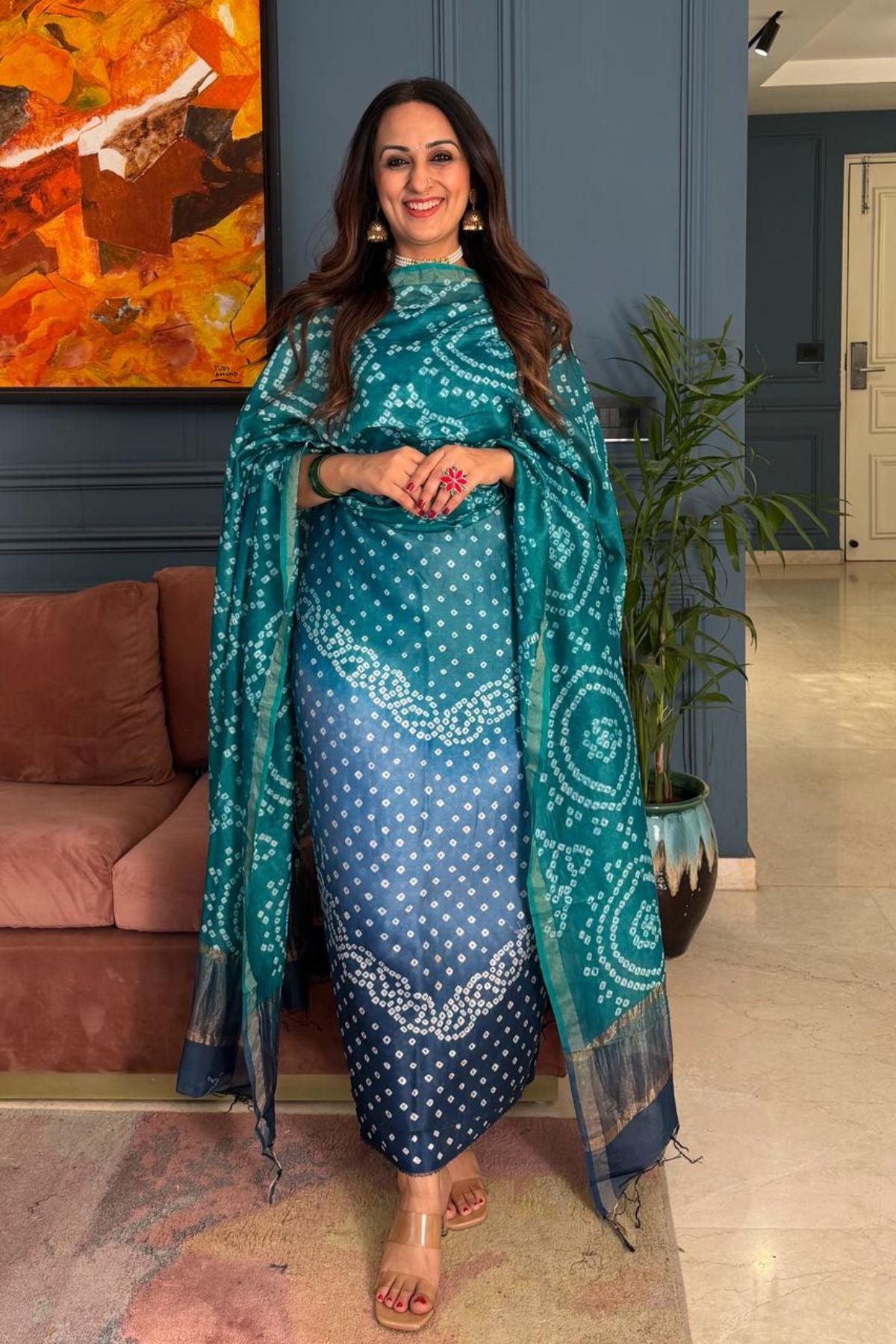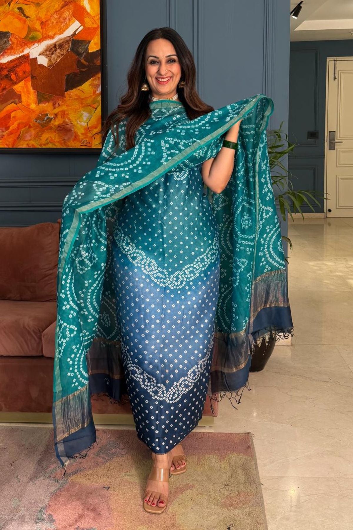Bandhani kurta dupatta set on shaded Chanderi silk!!